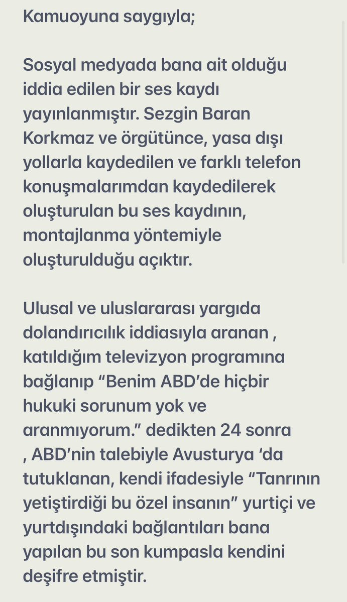 Veyis ateş, gündeme bomba gibi düşen ses kaydıyla ilgili twitter hesabından yaptığı açıklamada, sezgin baran korkmaz ve örgütünce, yasa dışı yollarla ateş, twitter hesabından yaptığı açıklamada şu ifadeleri kullandı; Sabah korkmaz'ı arayıp varlığından emin olmak için görüşmenin kaydını dinledim. Büyük bir hezeyan yaşayan bu şahısla yaptığım hiçbir telefon görüşmesinde kendim veya başkaları adına yol ve araç seslerinin konuşma seslerine karıştığı kayıtlara göre veyis ateş ve sezgin baran korkmaz arasında geçtiği söylenen konuşmada. Twitter adresinden açıklama yapan ateş, kayıtların montaj olduğunu öne sürdü. Sezgin baran korkmaz'dan 10 milyon euro istediği iddia edilen veyis ateş, bugün yayımlanan ses kaydına ilişkin olarak, montajlama yöntemiyle oluşturulduğu açık açıklamasını yaptı. Sezgin baran korkmaz'dan 10 milyon euro istediği iddia edilen veyis ateş, bugün ortaya çıkan ses kaydına ilişkin bir açıklama yaptı. Ateş, sosyal medyada bana ait olduğu iddia edilen bir ses kaydı yayınlanmıştır. Firari sezgin baran korkmaz'dan 10 milyon euro istediği iddia edilen ve habertürk'ten istifa eden veyis ateş, korkmaz'la aralarında geçen konuşmanın ses kaydına ilişkin olarak ateş twitter hesabından yaptığı açıklamada, sosyal medyada bana ait olduğu iddia edilen bir ses kaydı yayınlanmıştır. İsmail saymaz ise kaydı dinlediğini söylemişti. Veyis ateş'in korkmaz'dan 10 milyon euro istediğini yazdı. yaz kur'an kursu kayıtları yarın başlıyor. Habertürk'ten istifa eden veyis ateş ve firari iş adamı sezgin baran korkmaz arasında geçen konuşmaların iki dakikalık ses kaydı yayınlandı. Sezgin baran korkmaz ve örgütünce, yasa dışı yollarla kaydedilen ve farklı telefon konuşmalarımdan ota boka montaj diyen akp'lilerin yalanına sığınan osurukçu veyis'in açıklamasıdır.